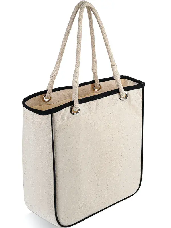 Las asas están enhebradas a través de resistentes ojales metálicos y aseguradas con nudos atados por expertos. Esta construcción mejora significativamente la capacidad de carga y la durabilidad de las asas, al tiempo que confiere a toda la bolsa un aire marítimo robusto pero refinado. Evoca imágenes de sol, arena y veleros, infundiendo a su marca un estilo de vida relajado, natural y exclusivo.